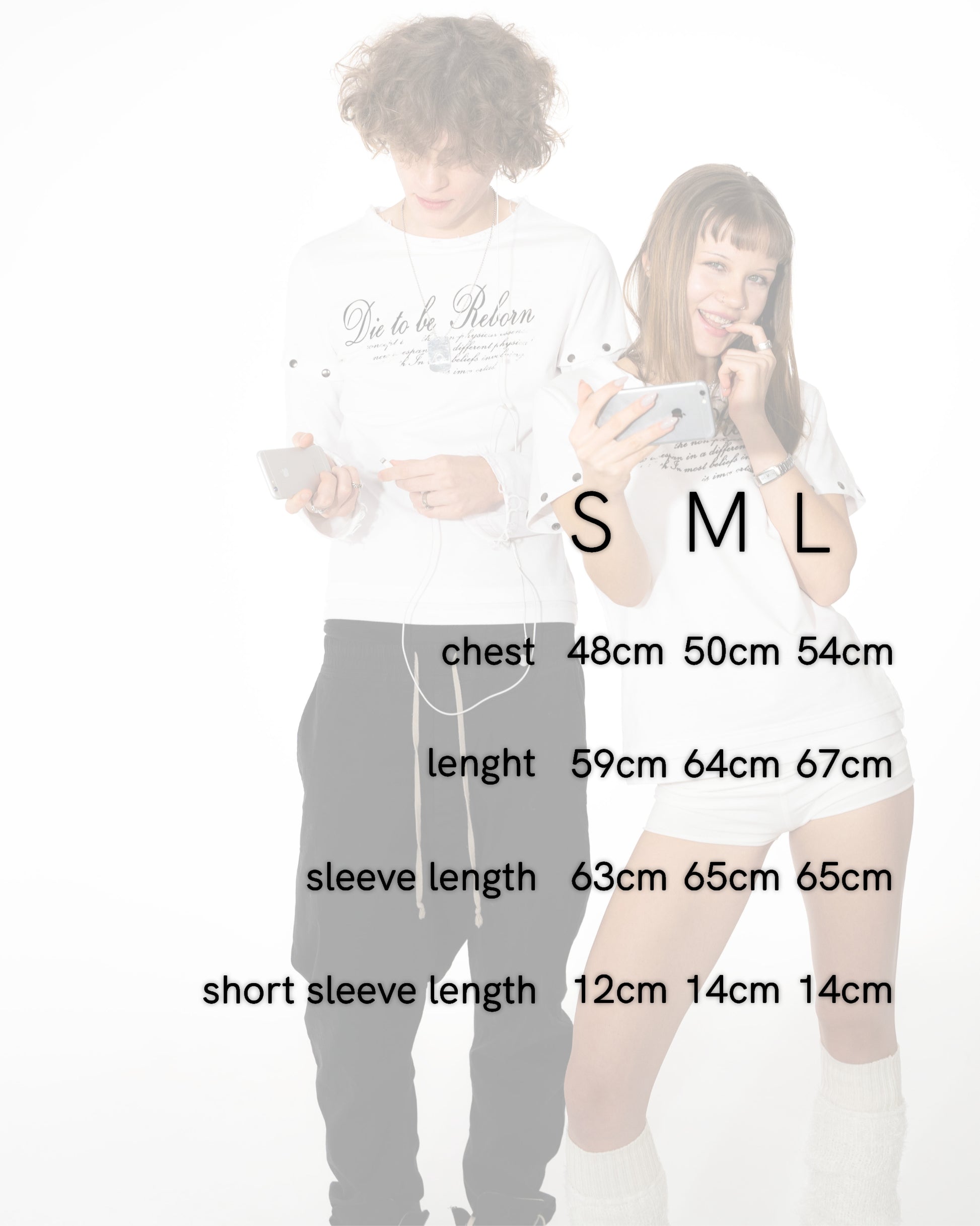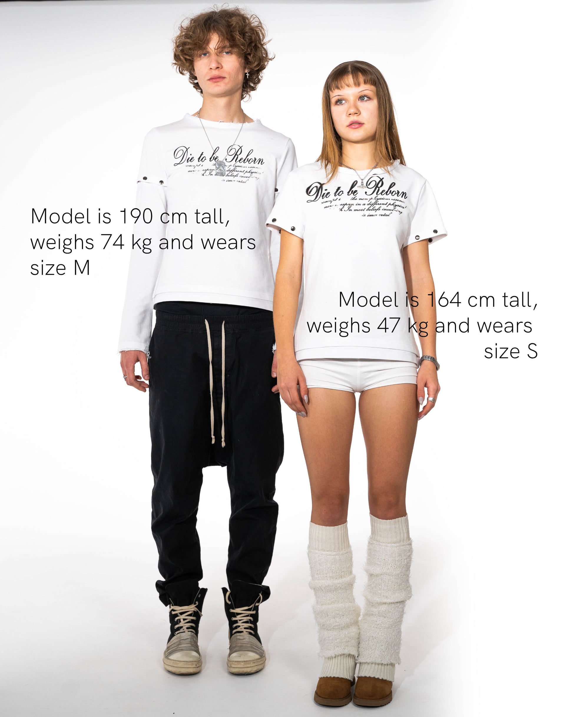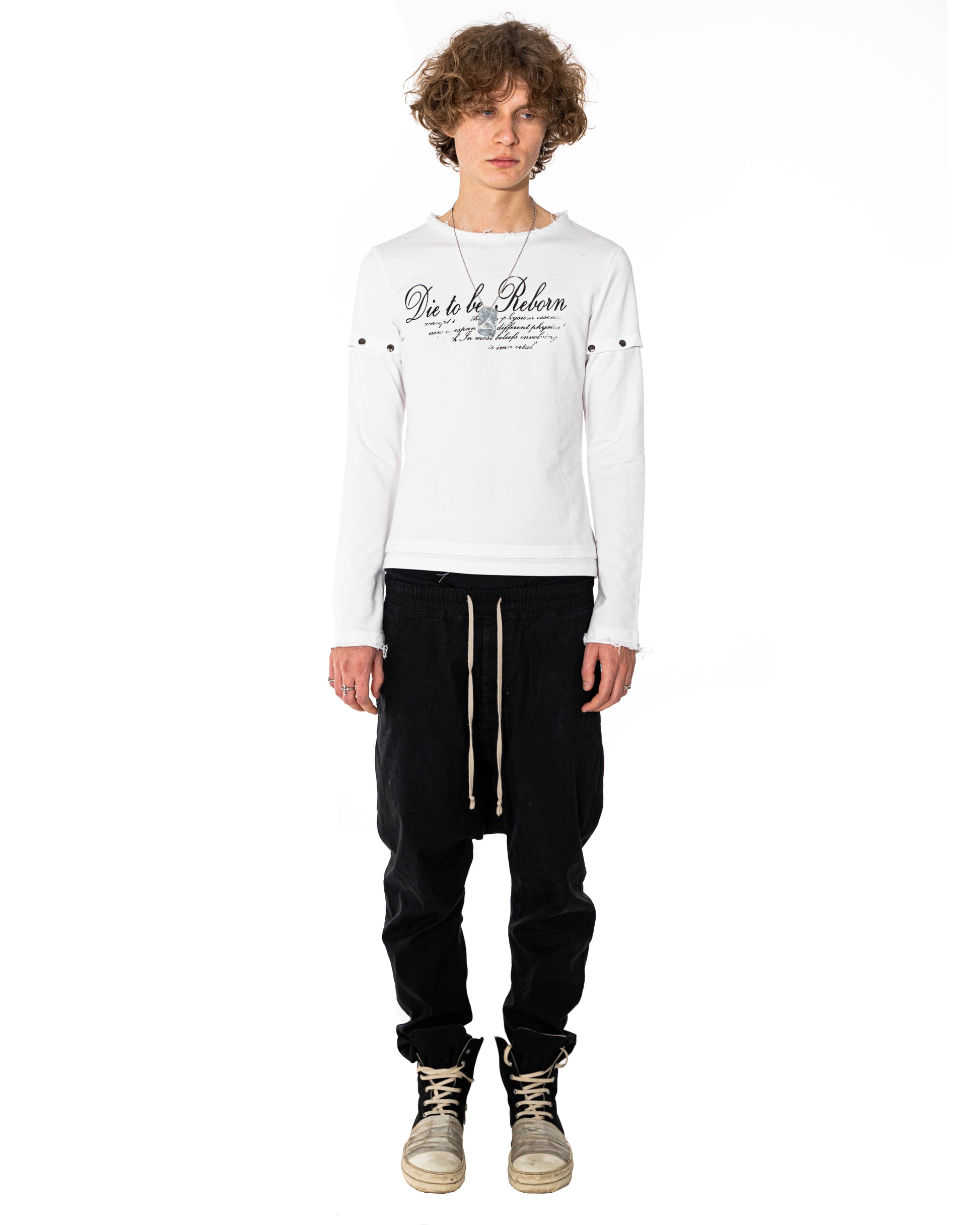 That’s what the T-long “Die to be Reborn” represents — not only through its distressed print, raw-finished sleeves and collar, but also through its unique fastening system that allows you to instantly transform a long-sleeve shirt into a classic T-shirt.